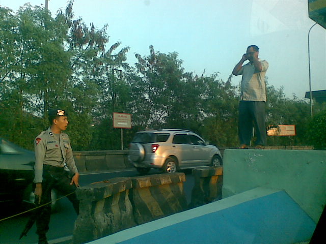 Tadi pagi (09 Juli 2008, jam 06:40 pagi) sewaktu melintas pintu tol Taman Mini ke arah tol dalam kota (Jakarta) ada bapak2 naek ke atas tembok dan lagak nya seperti sedang menelepon menggunakan HP.